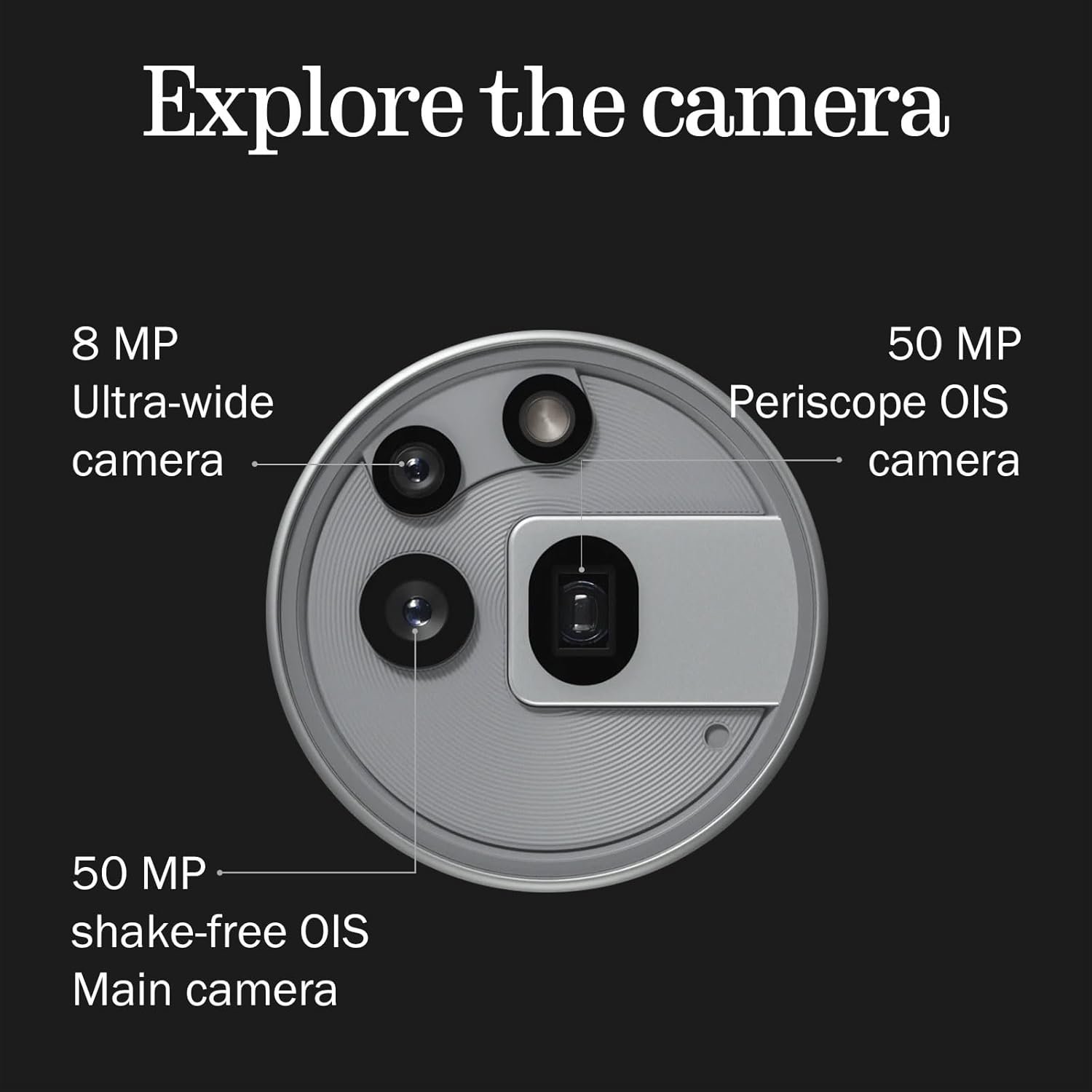 - Camera:The Nothing Phone (3a) Pro features a powerful triple-camera setup: a 50MP main camera with OIS, an 8MP ultra-wide camera with a 120° view, and a 50MP periscope telephoto camera with 3x optical zoom, all supporting 4K video and Ultra HDR. It also includes a 50MP front camera with 4K video and Ultra HDR for sharp selfies and video calls.